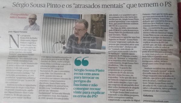 No fim-de-semana passado João Miguel Tavares publicou este artigo sobre Sérgio Sousa Pinto. Um vizinho que ainda compra o jornal da SONAE emprestou-me o seu exemplar para que fotografasse eu o texto. Fi-lo para o reproduzir, assim algo tardiamente respondendo à minha amiga-digital. Pois não gosto de Sérgio Sousa Pinto - mesmo que por vezes lhe “ache piada”, naquilo da boa verve -, dado que o homem é uma encenação que nos procura afirmar que ainda há algo de virtuoso no PS. Não há! Posso admitir que ainda sobrevivam alguns decanos, “seniores” dizem-nos agora, que se revêm e imaginam em Bad Münstereifel. Mas nisso apenas compõem um cenotáfio ideológico, moral se se quiser.